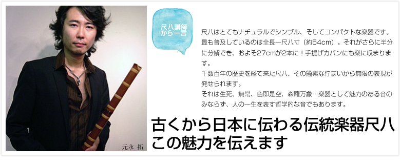 千数百年の歴史を経て来た尺八、その簡素な佇まいから無限の表現が発せられます。